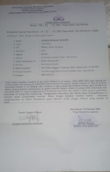 Pengaduan kepada polisi dengan nomor LP/97/II/PapuaBarat/Res Manokwari tentang dugaan pengeroyokan yang dilakukan oleh terlapor Erik Sesa Cs kepada George R. Konjol bersama keempat rekannya, termasuk Timotius Daud Yelimolo, Abinadab dan Nomensen.