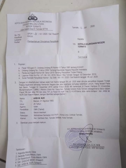 Surat Pemberitahuan dimulainya Penyidikan oleh Polres Ternate tertanggal 13 Juli, saya baru mendapatkan surat tersebut pada tanggal 14 Juli 2020 melalui kawan-kawan.