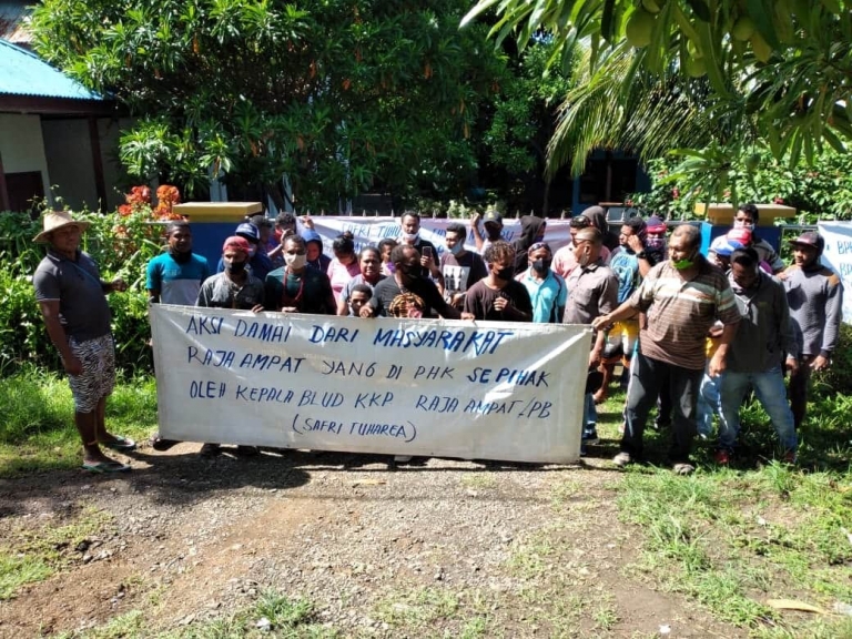 RAJA AMPAT, JAGAPAPUA.COM - Puluhan eks karyawan melakukan aksi demo damai, dan memalang Kantor BLUD-UPTD Kawasan Konservasi Perairan Kepulauan Raja Ampat, Papua Barat, Senin (20/7). Mereka memprotes pemecatan atau Pemutusan Hubungan Kerja (PHK) massal terhadap 96 karyawan oleh kepala BLUD Raja Ampat yang terjadi secara sepihak.
