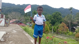 BINTUNI, JAGAPAPUA.COM - Seorang anak kecil nampak bersemangat berlari sembari mengibarkan bendera Merah Putih kecil di tangannya. Ia bernama Regen Waney, siswa TK di tanah Rorandey kampung Idoor di distrik Wamesa, Kabupaten Teluk Bintuni, Provinsi Papua Barat.