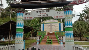 BINTUNI, JAGAPAPUA.COM - Warga Distrik Wamesa nampak tengah melakukan persiapan peringatan HUT Pendaratan Injil di Kampung Idoor tanah Rorandei. Persiapan sejauh ini secara fisik ornamen tugu peringatan telah selesai dicat dengan rapi. Panitia nampak menjahit atap dari daun nipa untuk menutup dapur konsumsi.