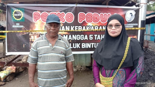 TAHITI, JAGAPAPUA.COM - Ketua Majelis Taklim kampung nelayan bersama masyarakat mendatangi korban bencana kebakaran di kampung Tahiti, Kelurahan Bintuni Timur, Kabupaten Teluk Bintuni, Rabu (9/3/2022).